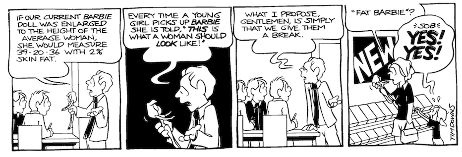 Of note is the "Fat Barbie" storyline, which appeared the week of August 5th, 1985. I had immediately thought of when Mattel introduced the "curvy" Barbie in 2016, over 30 years after the original run of the strip, but at the time I hadn't really considered adding any scans. It should be noted that the real-life "Fat Barbies" weren't a success and were seen as social engineering on Mattel's part.