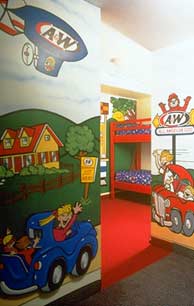 The "KidSuites" had an array of commercial and generic designs (the commercial ones probably had a hand in sponsoring the hotel somehow, like Kellogg's products served at breakfast). It should be noted that several of the Holiday Inn-branded hotels in the Orlando/WDW area (and beyond) had these sorts of room-within-a-room but none of them had the other types of rooms that the Holiday Inn Family Suites Resort had. The Nick-era rooms have all been fairly well-documented, from shows that were popular when the hotel opened (Danny Phantom, Jimmy Neutron, etc.) to themes that were added later in the hotel's lifespan, like the latest incarnation of Teenage Mutant Ninja Turtles. Here are the themes that were at the hotel pre-renovation. It's possible even more were part of the mix, though not necessarily at the same time.